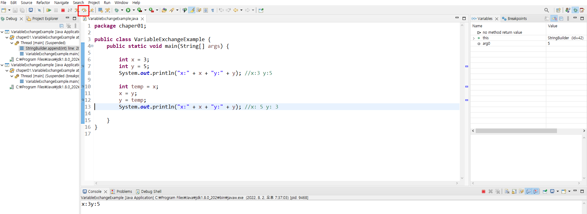 3) 상단에 있는 step over 아이콘 클릭시 한 줄 한 줄 이동하면서 확인해볼 수 있다.