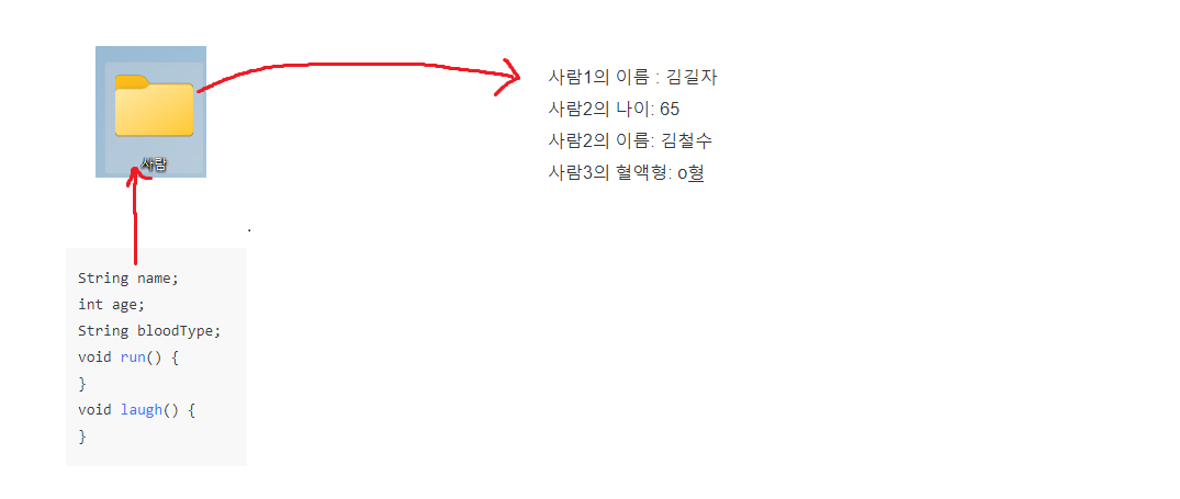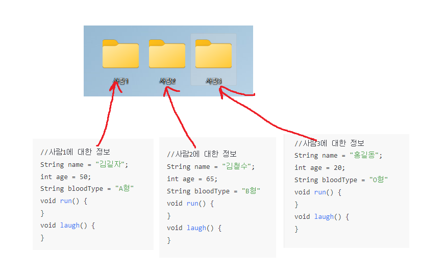 이렇게 사람1, 사람2, 사람3에 대한 폴더를 만들어서 폴더 별로 그 사람에 대한 정보를 담으면 훨씬 깔끔하게 정리되는데, 이때 정보들을 담을 수 있는 저 폴더들을 프로그래밍에서는 "클래스"라고 부른다.